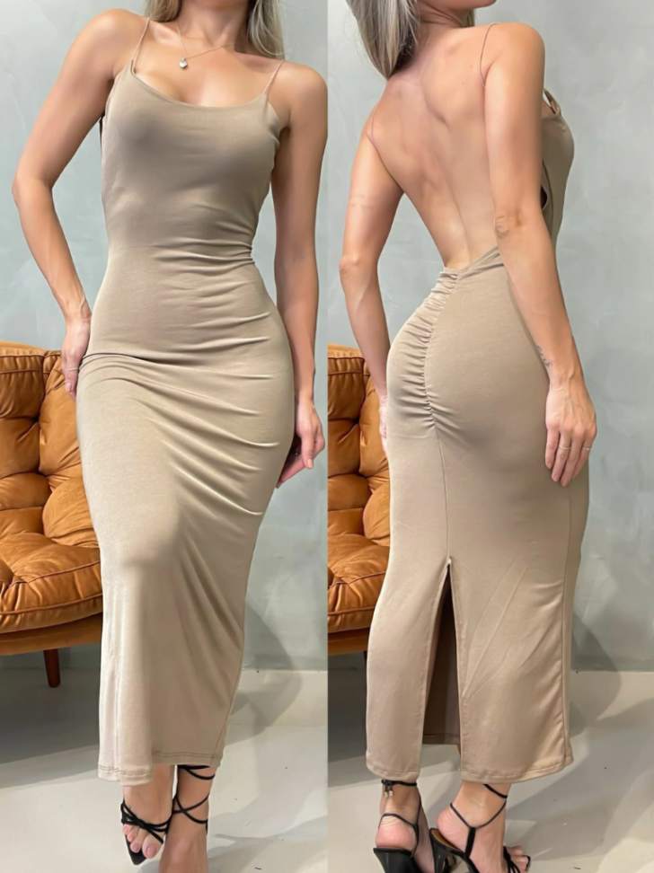 Para um look casual, combine o vestido com sandálias rasteiras e acessórios delicados. Se a ocasião pede algo mais sofisticado, experimente com scarpins e uma clutch glamourosa. O detalhe plissado nas costas adiciona um toque especial que fará você se destacar em qualquer lugar.